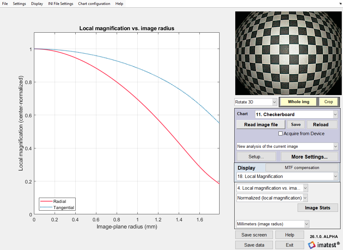 Note: Local magnification calculations are separate from other pre-existing geometric distortion calculations in Imatest. Imatest checkerboard analysis produces radial distortion models that are separate from those related to local magnification and are also dependent on separate settings, calculations, etc.