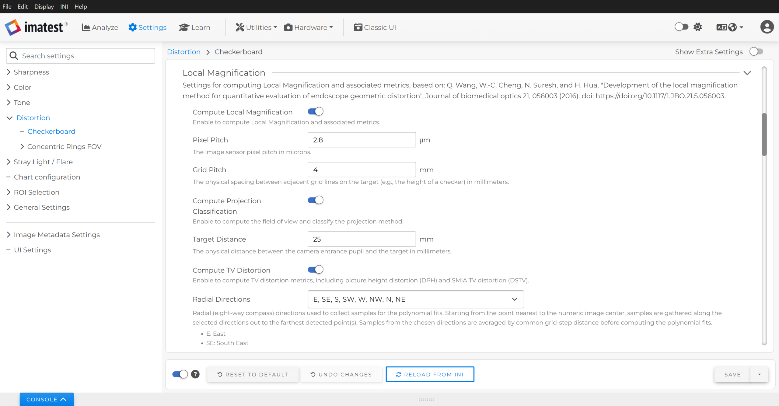 - (Optionally) Enable Compute TV Distortion to have Imatest compute TV distortion metrics from the local magnification data. TV distortion results are included in the JSON/CSV outputs.