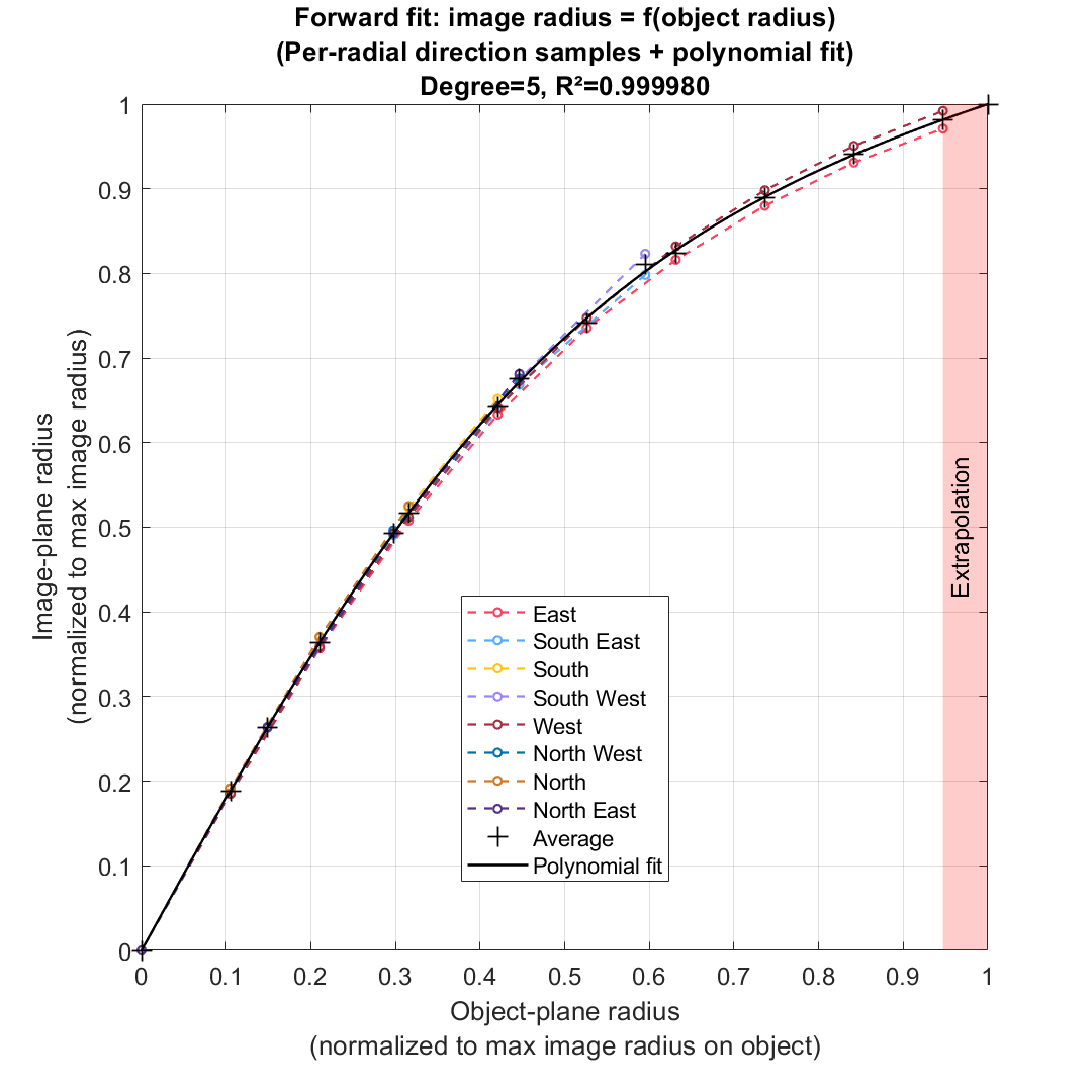 - Image vs. object radius (forward fit): A plot showing image radius vs. object radius, with samples from each radial direction and the polynomial fit for image radius as a function of object radius in the normalized domain. Samples from each direction are averaged by common grid-step distance before computing the polynomial fits.