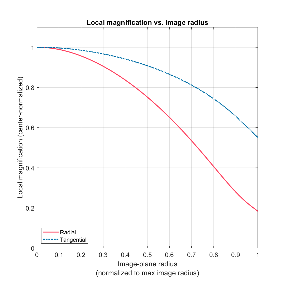 Note: Plot axes units are configurable. Axes for local magnification can be expressed in either absolute terms (image scale factor) or center-normalized. Axes for image radius can be expressed in units of either pixels, millimeters (on image sensor), or normalized (to max image radius). Axes for object radius can be expressed in units of either grid steps, millimeters (on object), or normalized (to max image radius on the object).