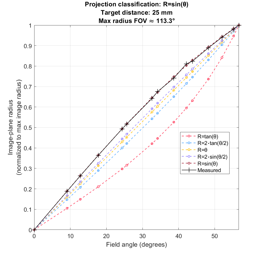 - Projection classification: A plot showing image radius vs. field angle, including canonical projection mapping functions and estimated field of view.