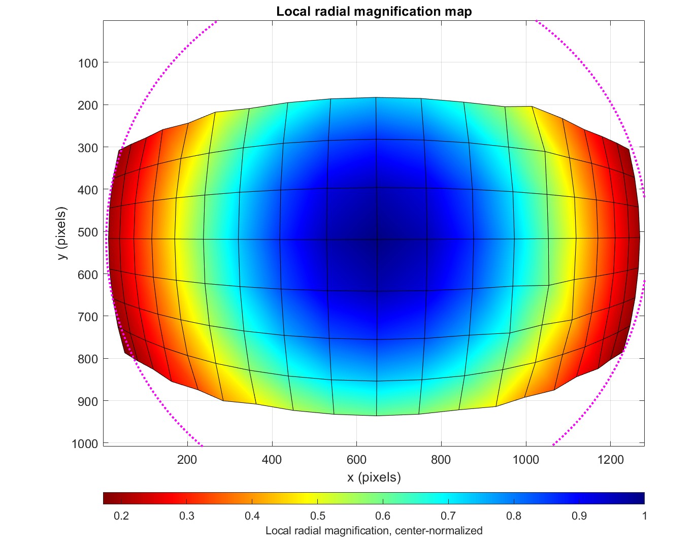- Check that the (center-normalized) local magnification matches what one’s eyes see with respect to how the grid size varies within the image.